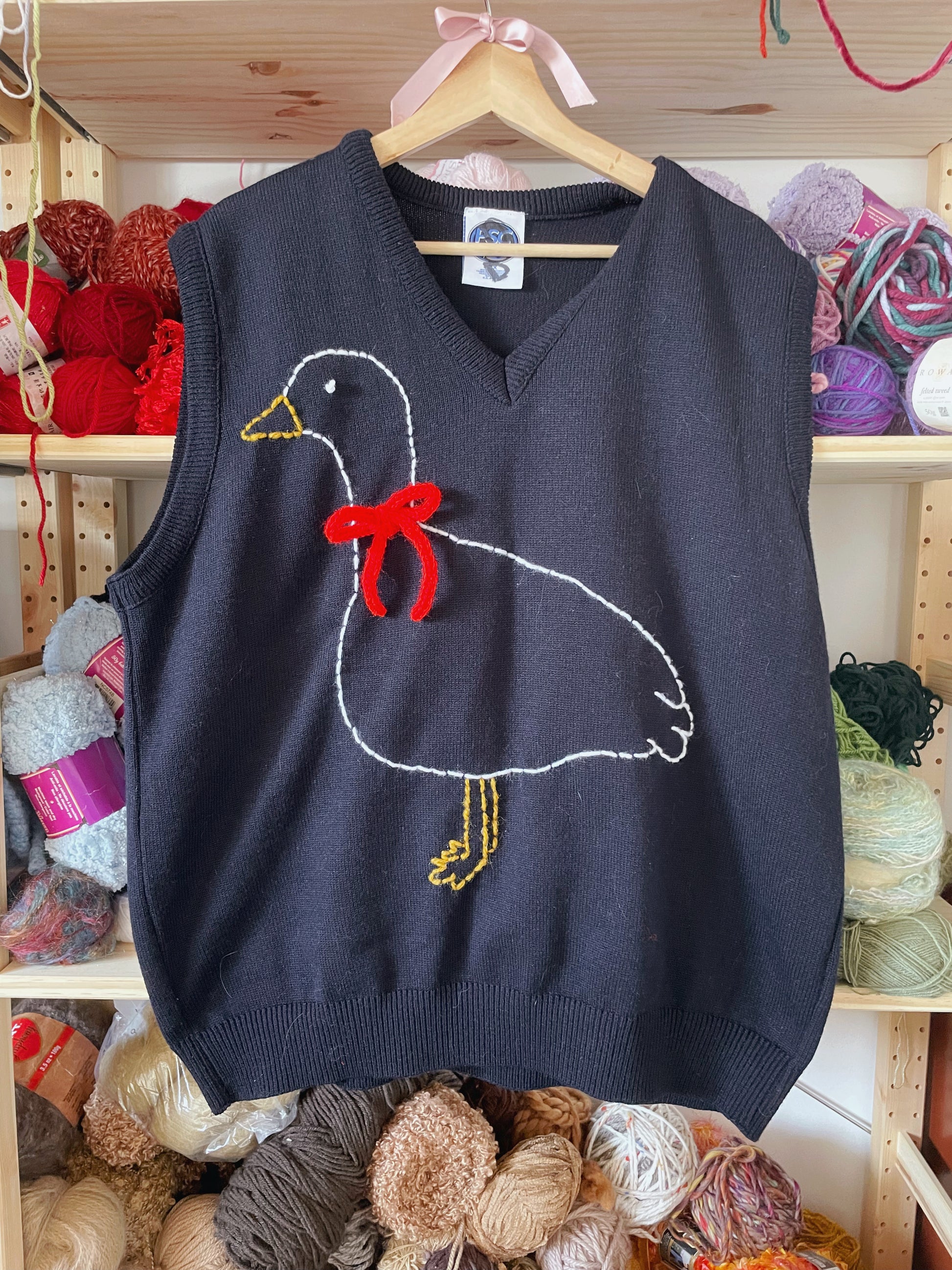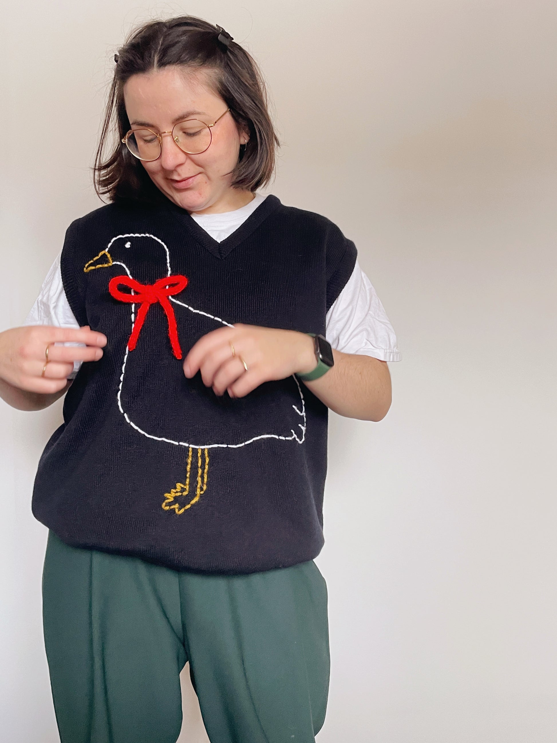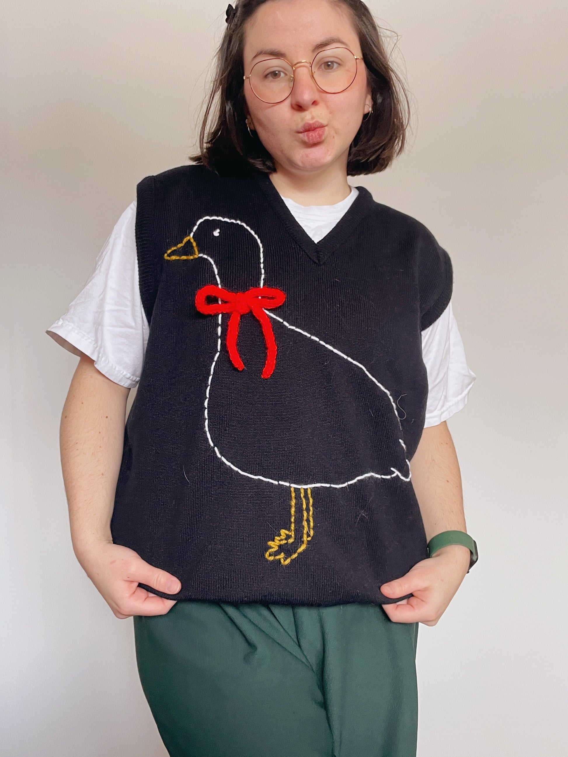 Silly goose hand embroidered on a thrifted sweater vest with a bow (is there anything better?)