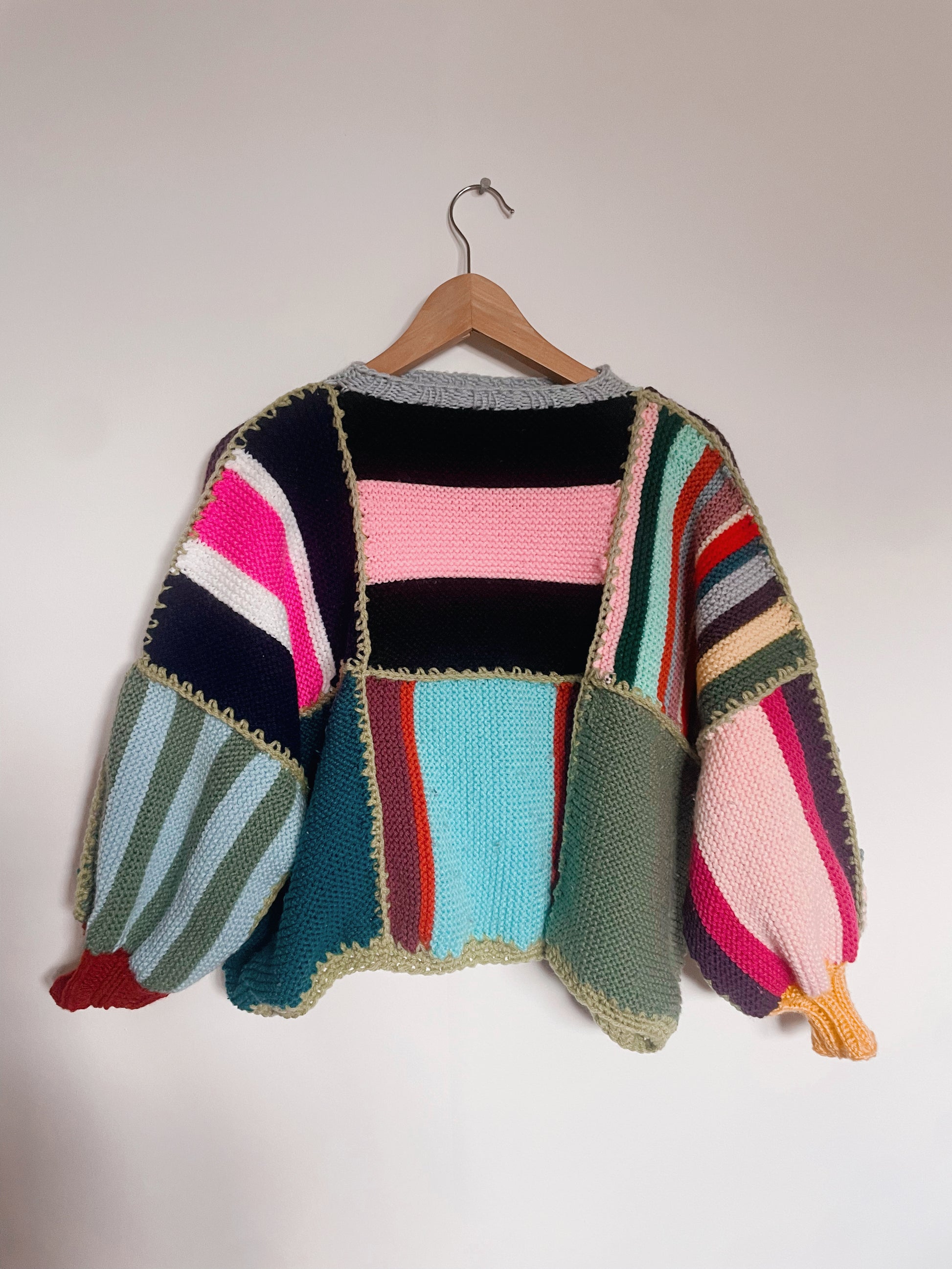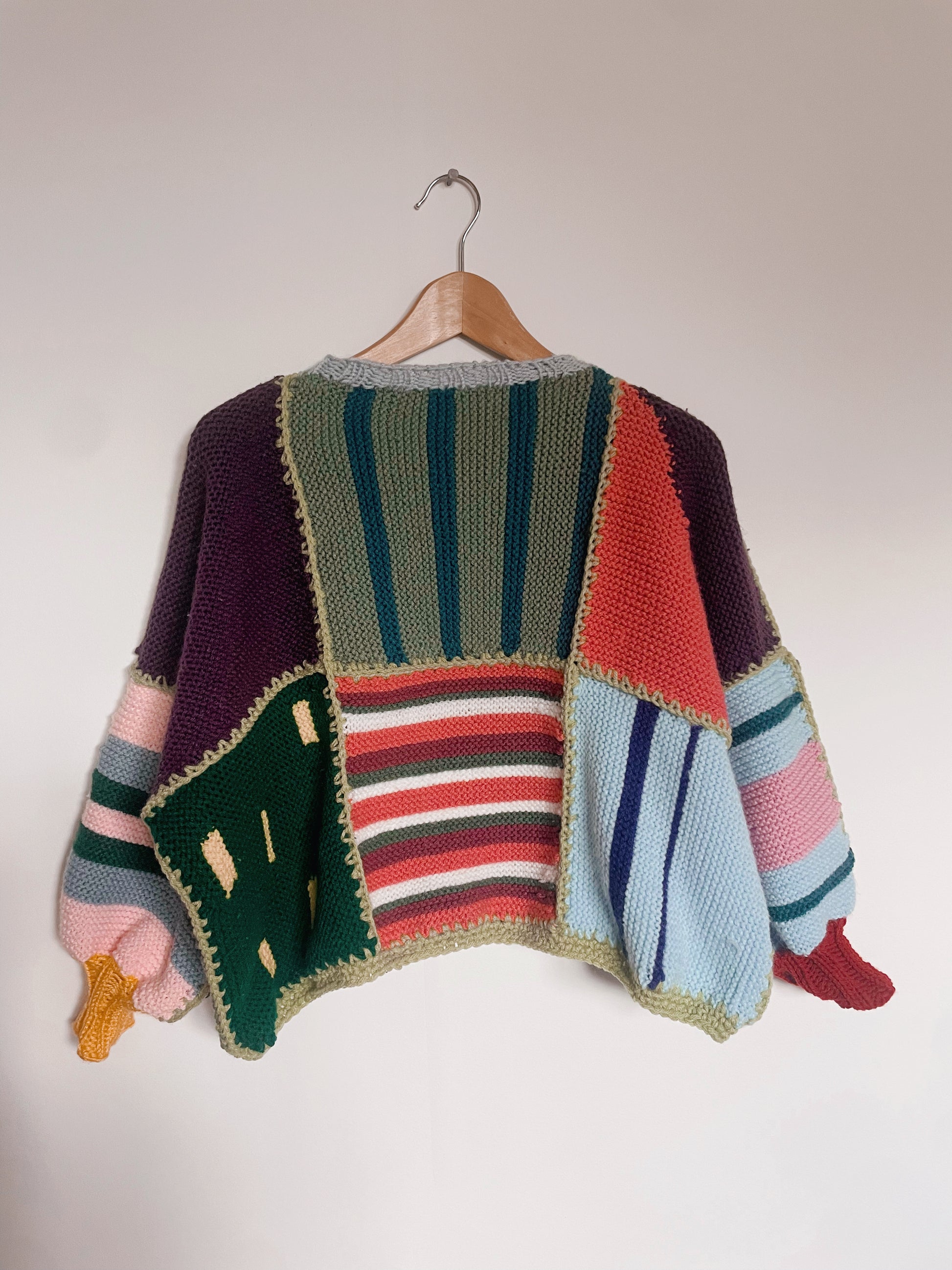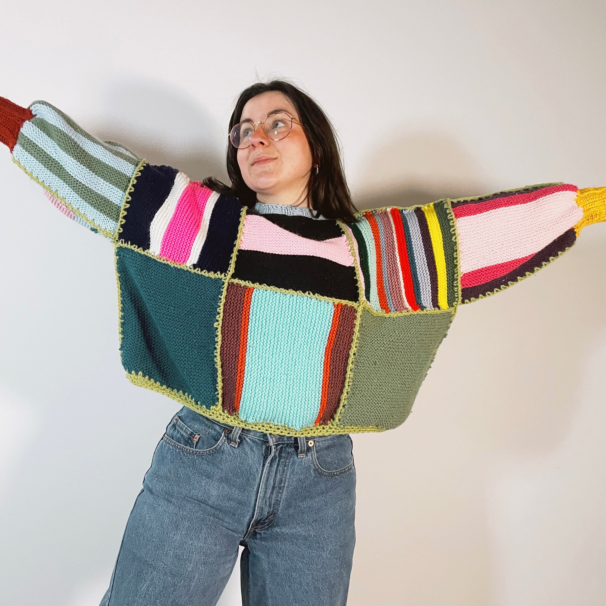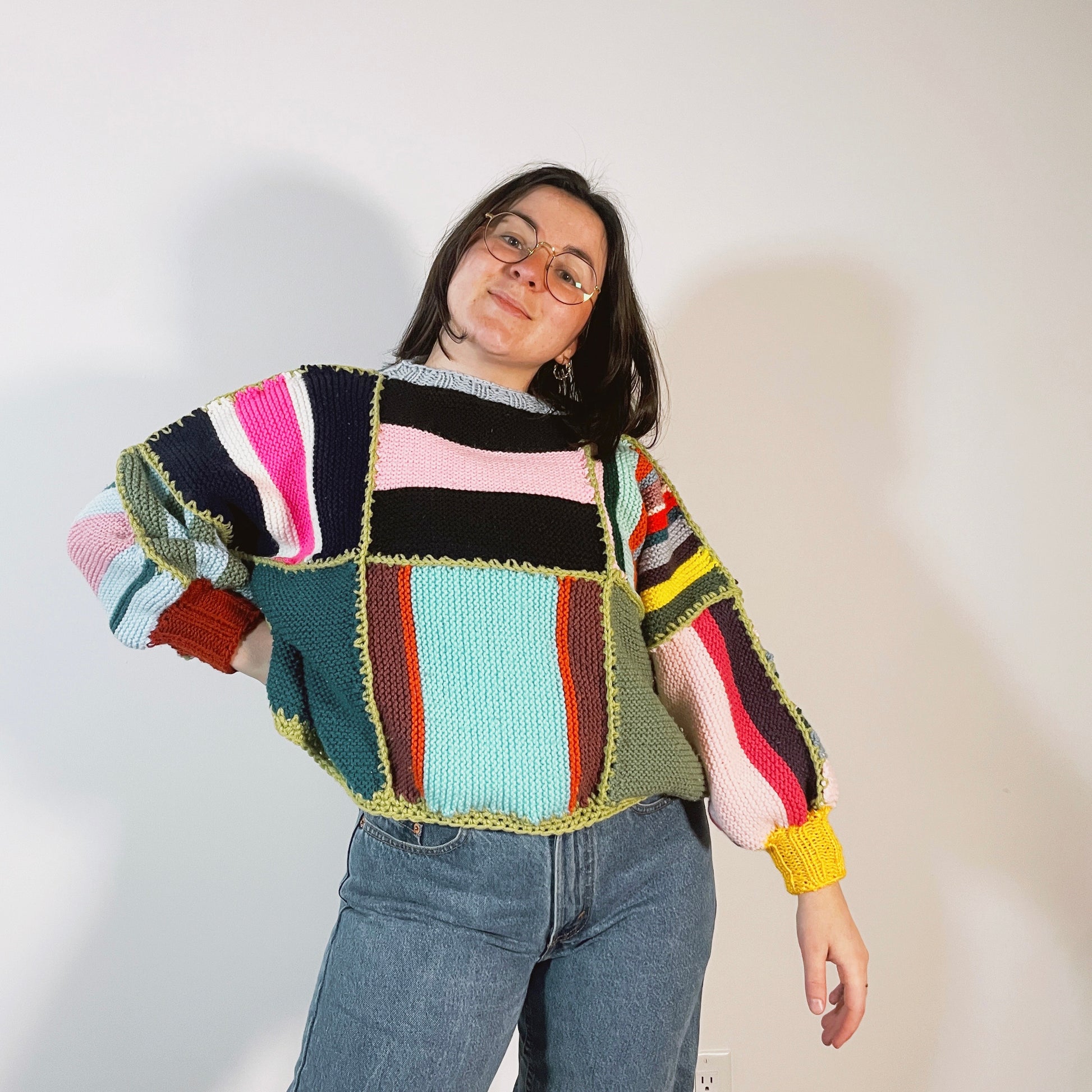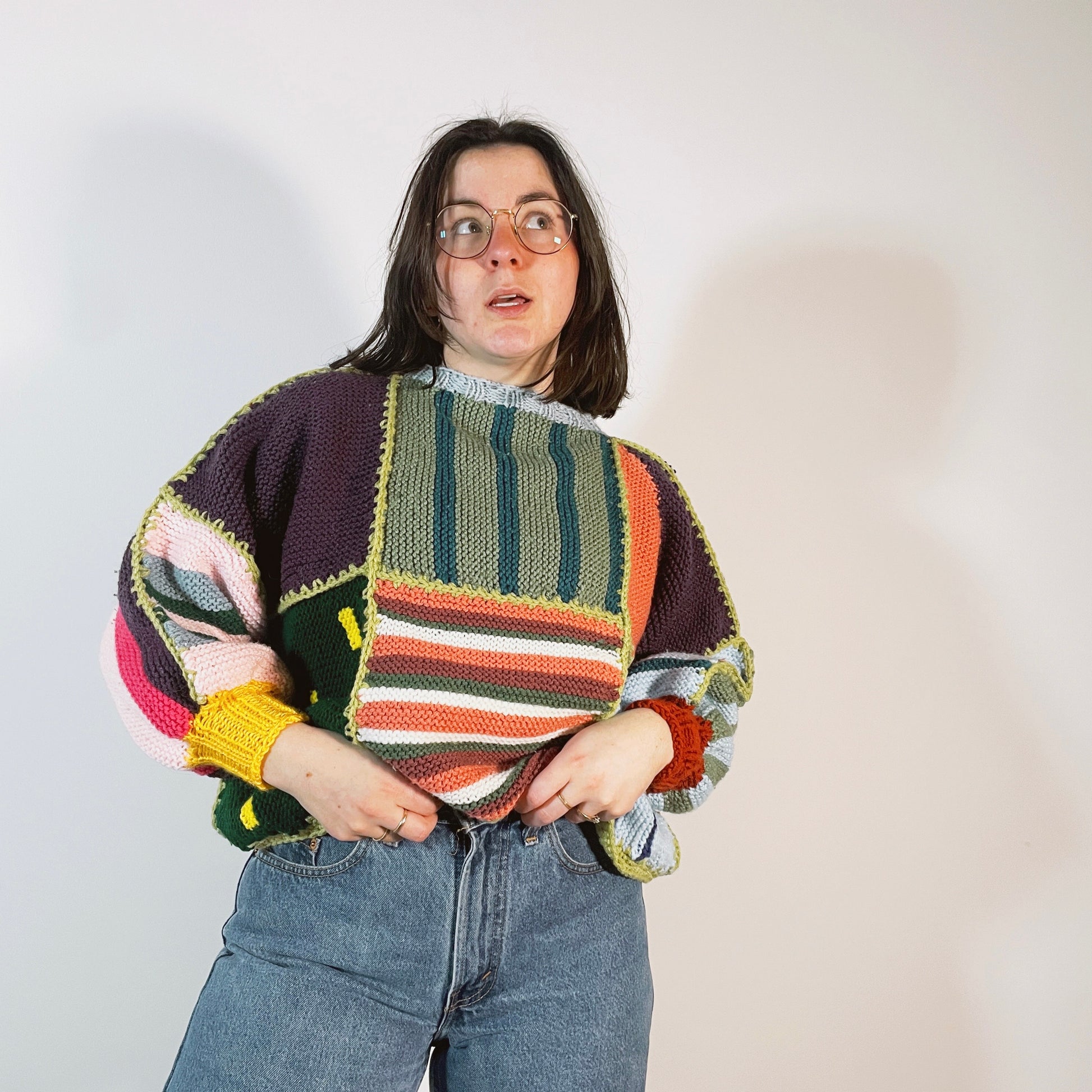 This was a vintage blanket that I upcyled to make a cozy sweater! It would fit a size M the best but could fit a S or a L. The sweater is reversible! All yarn is thrifted.