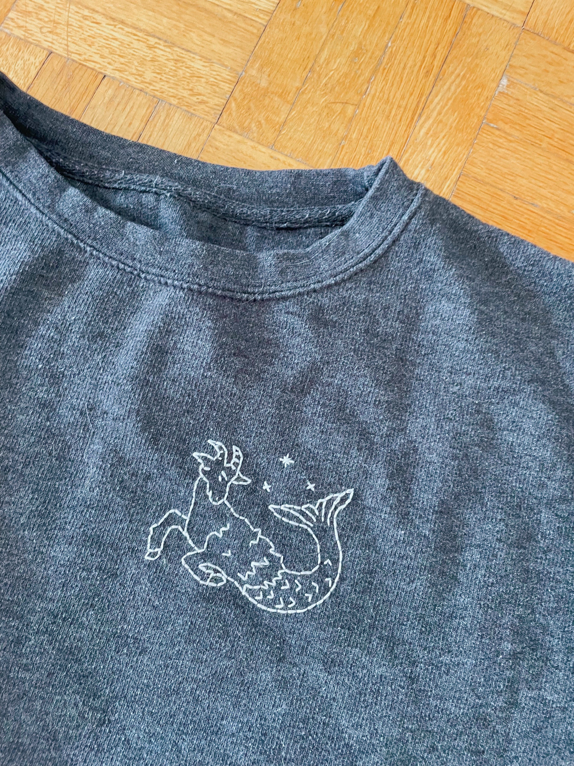 Whimsical Sea goat embroidered on a thrifted long sleeves