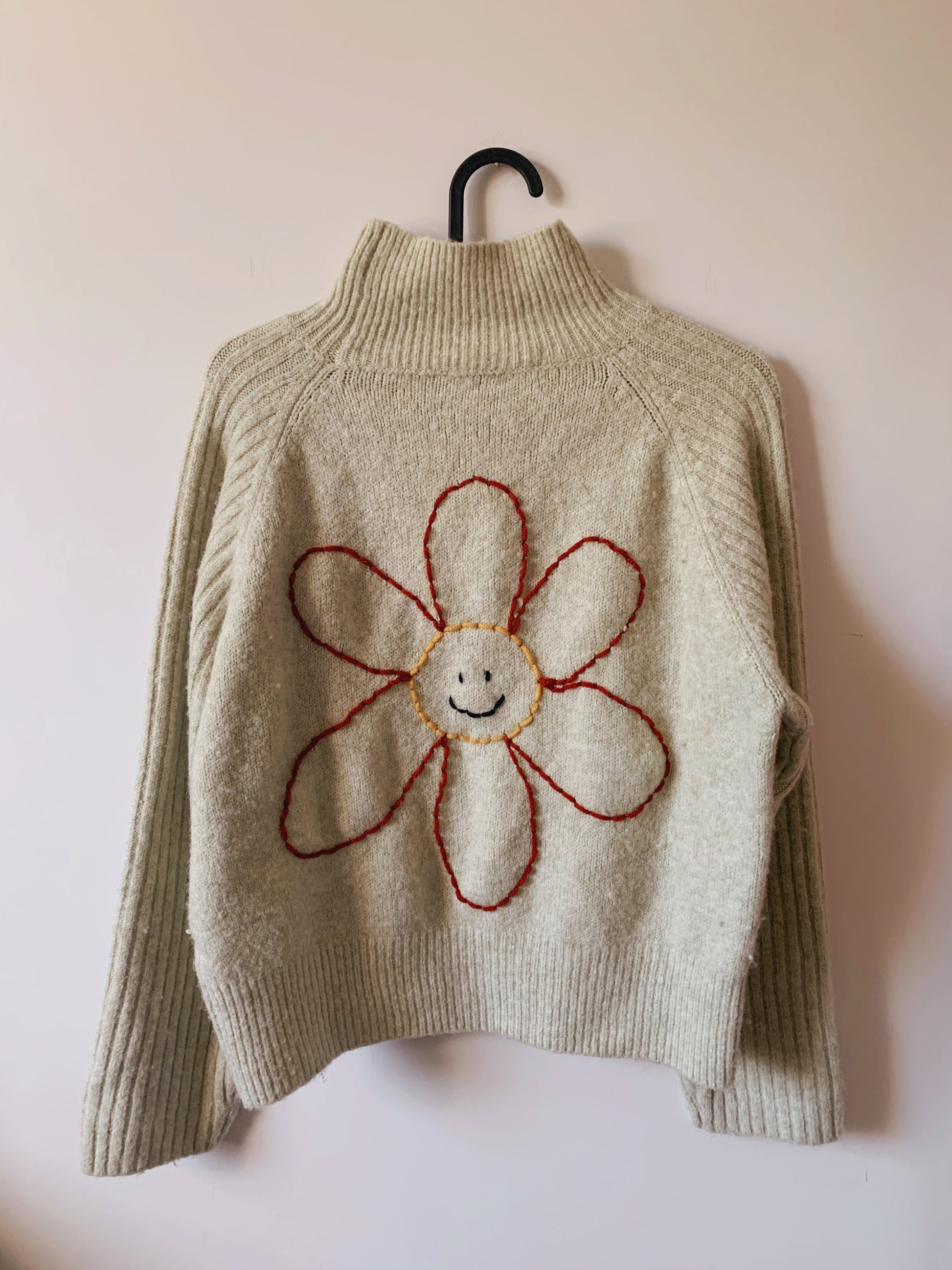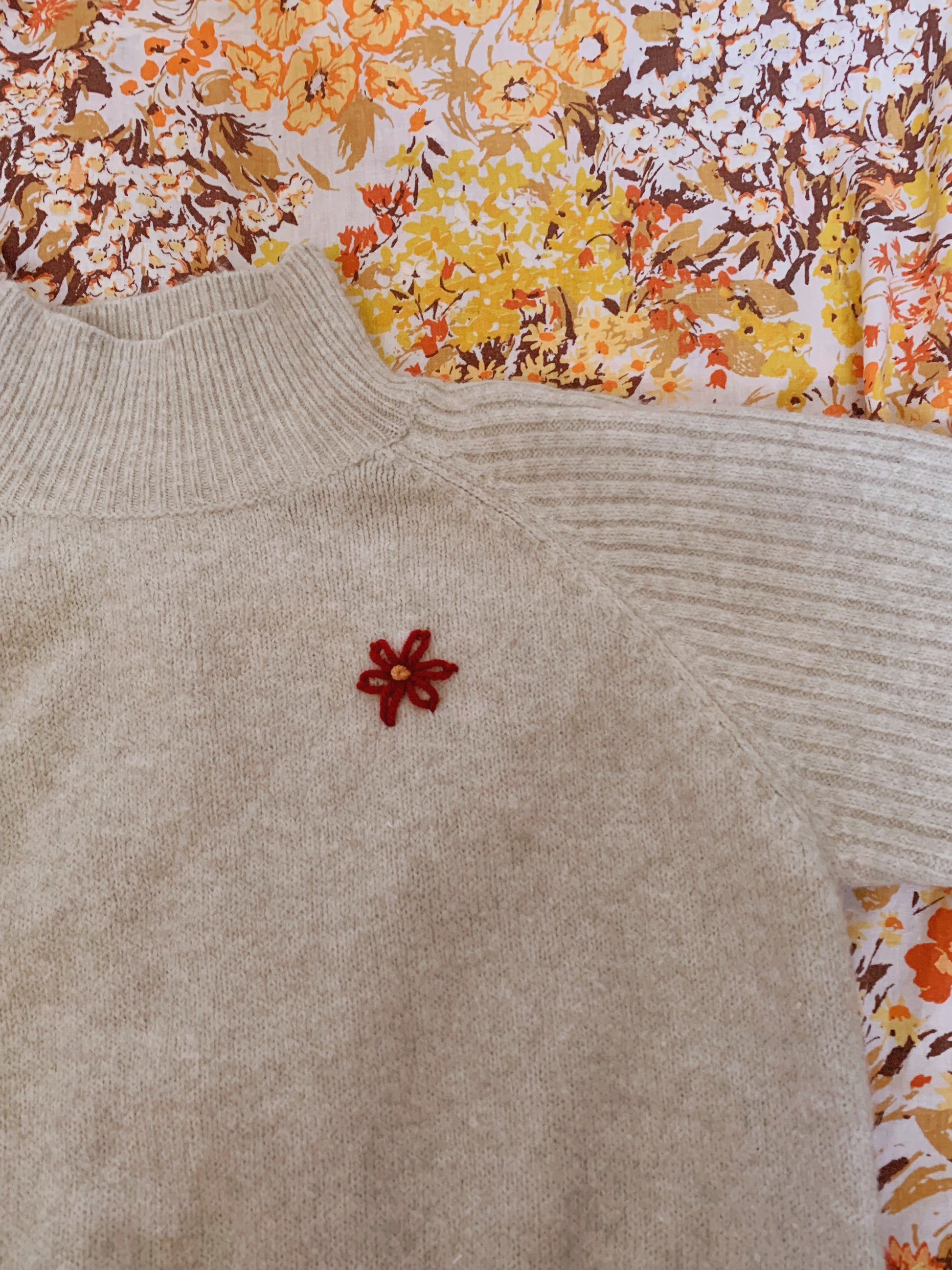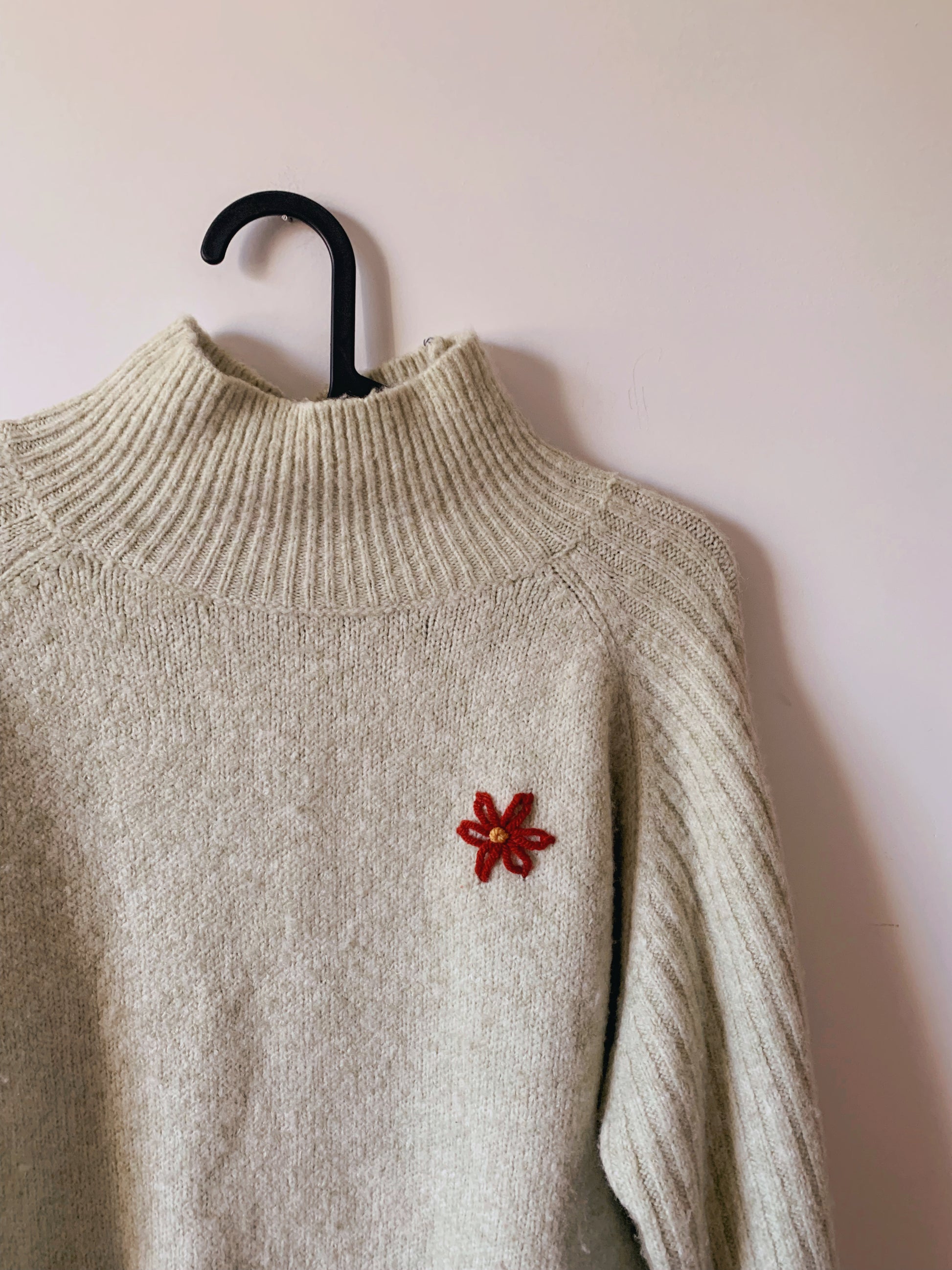 Flowers hand embroidered with wool on a thrifted sweater