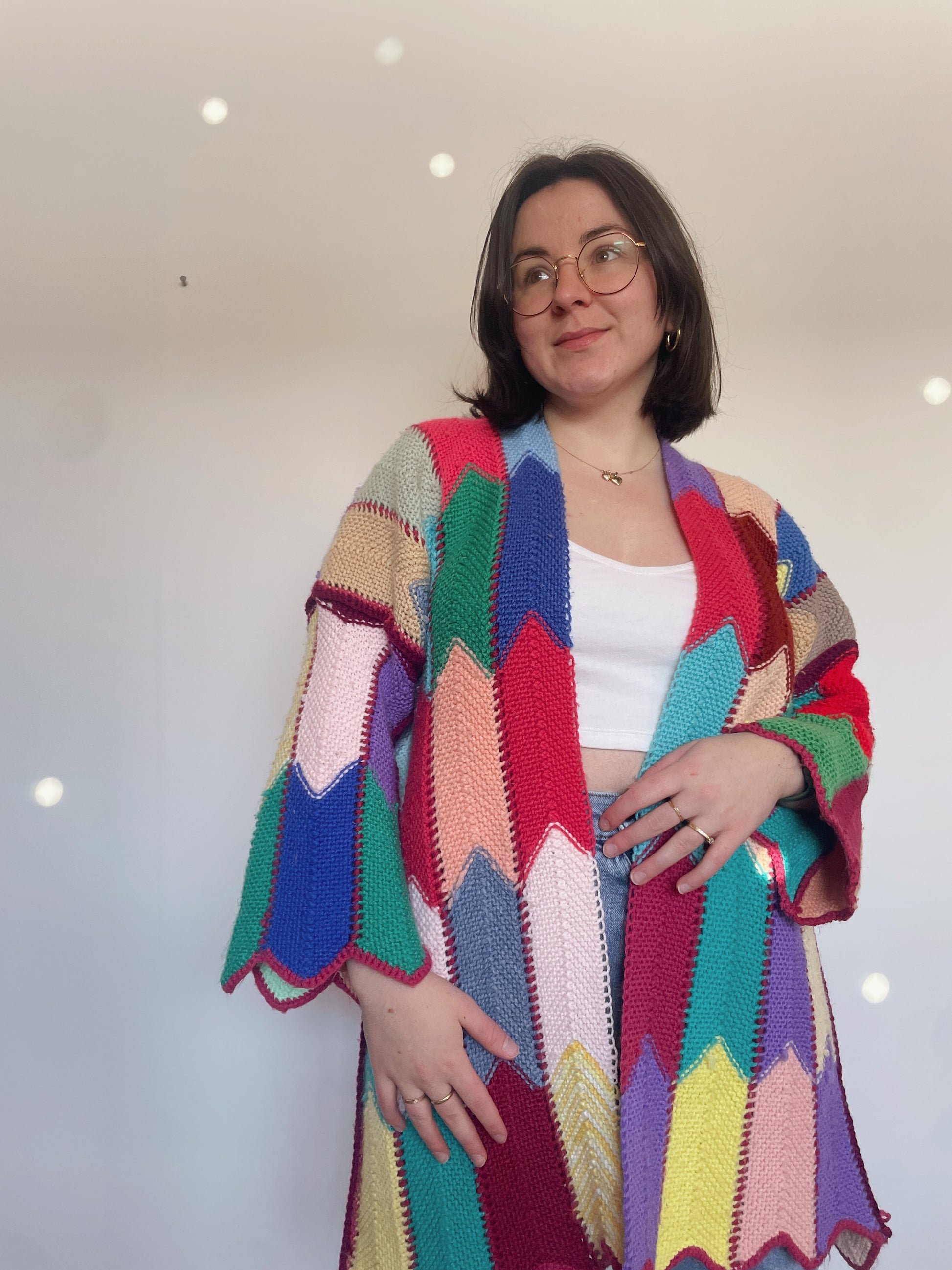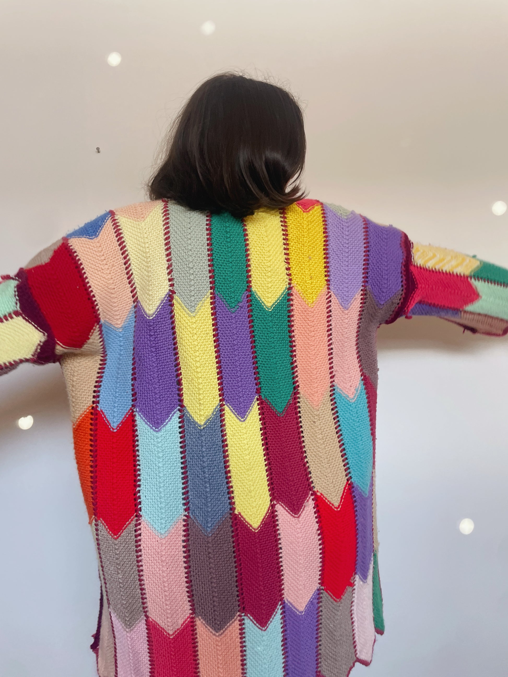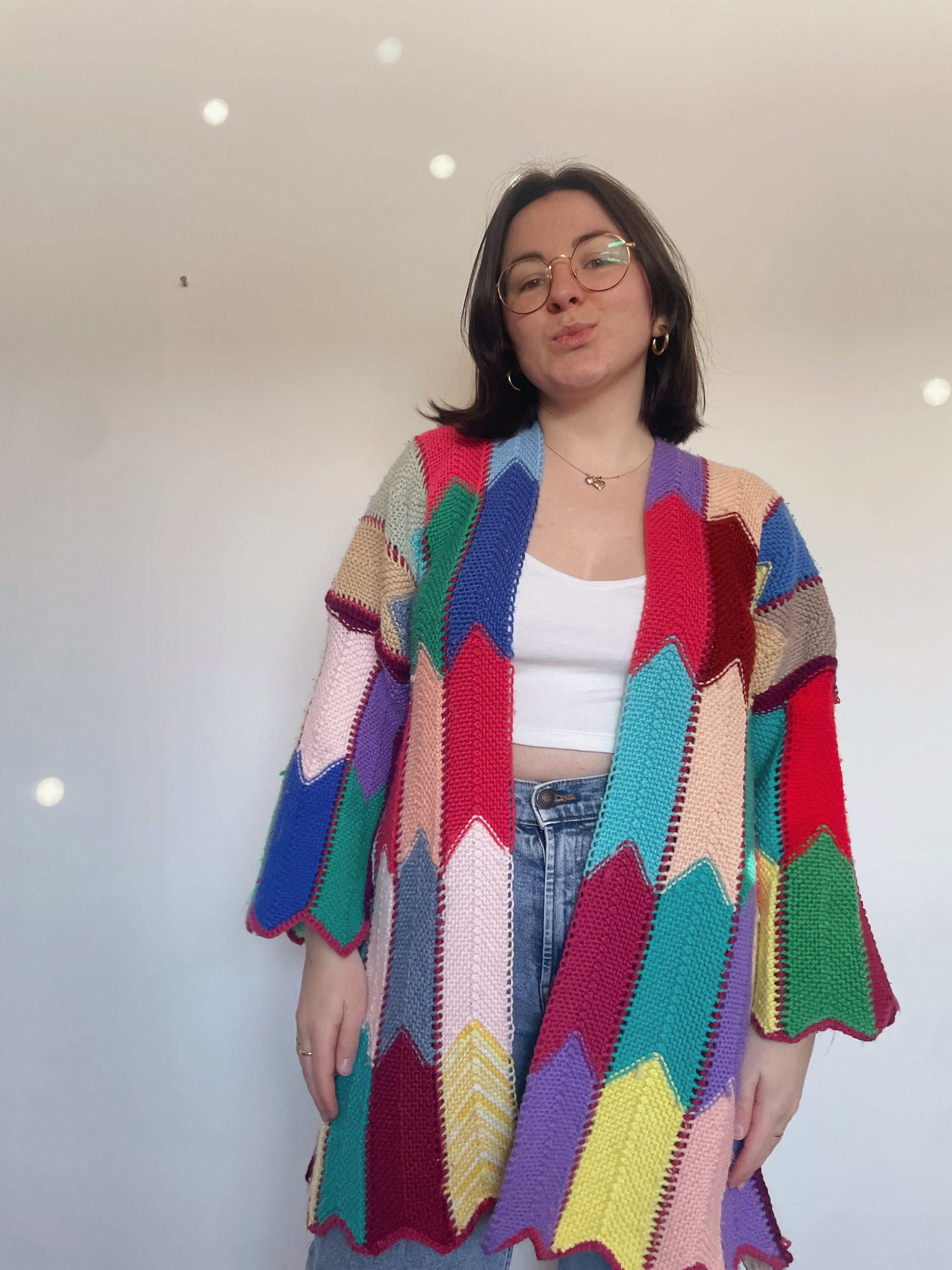 This was a vintage blanket that I upcyled to make a cozy cardigan! It would fit a size M the best but could fit a S or a L